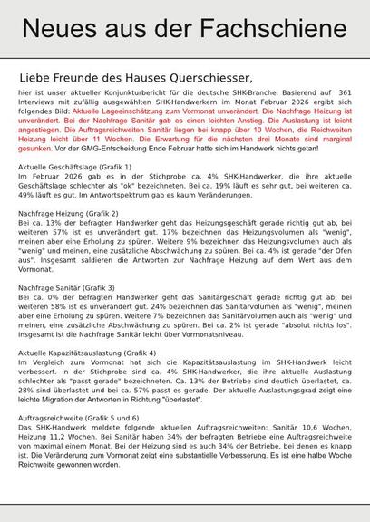 Inhalte der aktuellen Ausgabe sind (1) die Konjunktur im SHK-Handwerk , (2) Nachfrage Sanitär & Heizung (3) Kapazitätsauslastung, (4) Auftragsreichweite (4) Montagekapazitäten.