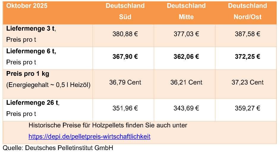 DEPI-Pelletpreis Oktober 2025 6 t bundesweit: 366,25 €/t