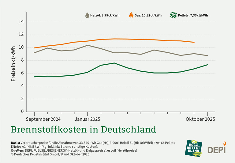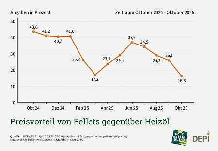 Im Oktober steigt der Holzpelletpreis wie üblich dem Saisonverlauf nach an. So kostet eine Tonne (t) Pellets laut Zahlen des Deutschen Pelletinstituts (DEPI) im Durchschnitt 366,25 Euro bei 6 t Abnahmemenge. Die Kilowattstunde klimafreundliche Holzenergie kostet zum aktuellen Zeitpunkt 7,33 Cent. Das sind 9,3 Prozent mehr als im Vormonat. Im Vergleich zu Erdgas liegt der Preisvorteil bei rund 32 Prozent. Zu Heizöl beträgt der Preisvorteil aktuell 16,3 Prozent.