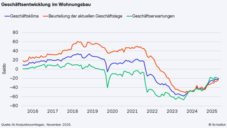 Die Stimmung im Wohnungsbau hat sich im November etwas aufgehellt. Der ifo Geschäftsklimaindex stieg von -22,8 auf -21,0 Punkte. Die Unternehmen schätzten ihre Lage besser ein. Ihre Erwartungen für die kommenden Monate bleiben jedoch verhalten. „Die Unternehmen im Wohnungsbau sind aktuell zwar weniger pessimistisch“, sagt Klaus Wohlrabe, Leiter der ifo Umfragen. „Die Zukunftsaussichten bleiben jedoch unverändert schwach.“