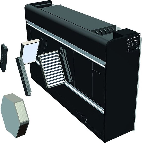 Eine mitgelieferte Montageplatte aus Metall, versehen mit Vorgaben für Zu- und Abluftöffnungen sowie integrierten Stehbolzen, erlaubt eine einfache Installation. Auch der Filterwechsel ist schnell und unkompliziert möglich. Zusätzlichen Komfort bieten die Reset-Taste für die Filterwarnung und die zentrale Regelung über die HsenBoxx.