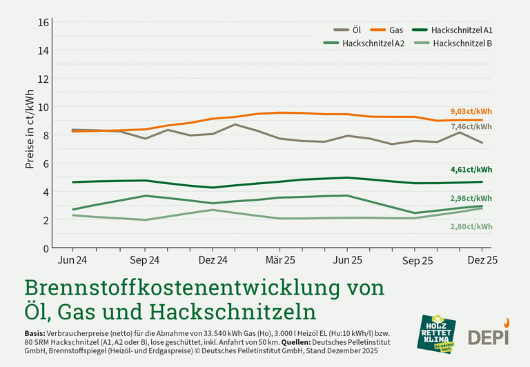 Ungeachtet der leichten Preissteigerung bleiben Hackschnitzel eine wirtschaftlich attraktive Option für die Wärmeversorgung. Im Vergleich zu fossilen Energieträgern ergibt sich weiterhin ein deutlicher Kostenvorteil: Gegenüber Heizöl sind Hackschnitzel rund 38 Prozent günstiger, im Vergleich zu Erdgas sind es etwa 49 Prozent.