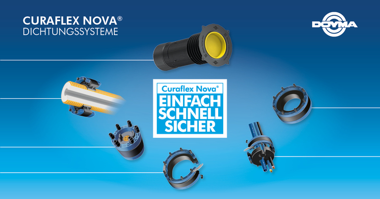 Die Produktreihe Curaflex Nova® von DOYMA GmbH & Co umfasst sichere sowie wartungsfreie Abdichtungslösungen. Aufgrund der Farbe ihres Gestells werden sie häufig auch die "Blauen“ genannt. Egal ob es sich um drückendes oder nichtdrückendes Wasser handelt – mit diesen Dichtungseinsätzen sind Sie stets auf der sicheren Seite. Außerdem gewährt DOYMA auf das Curaflex Nova®-Produktsortiment eine außergewöhnliche Garantie von 25 Jahren, die die gesetzlichen Regelungen deutlich übersteigt. Ein weiterer Vorteil der Produktreihe ist der DOYMA Grip, der das Rutschen der Ringraumdichtung unter Belastung durch reibungsmindernde Substanzen verhindern kann. Durch das Soft Tight System (kurz STS) ist eine besonders schonende Abdichtung, vor allem bei empfindlichen Rohren wie Wellrohren, möglich. Darüber hinaus sorgen die steckbaren DOYMA Diameter Extension Module dafür, dass Anpassungen an verschiedene Medienleitungsdurchmesser schnell und ohne Werkzeug vorgenommen werden können.