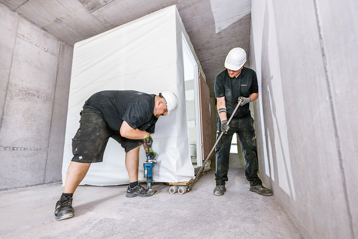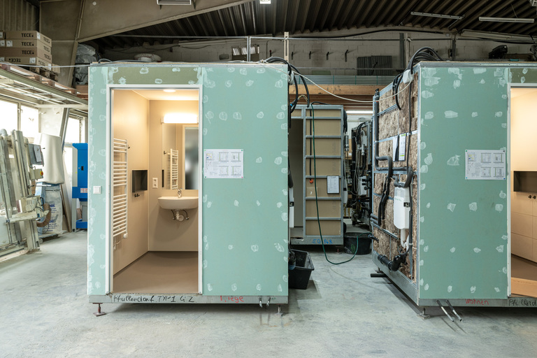 In enger Abstimmung zwischen Bauherr, Planer, Modulhersteller und Geberit wurden die Badmodule vollständig vorgefertigt. Die Fertigung erfolgte im Werk von GVG Sanitärsysteme, einschließlich der Rohrleitungen, Sanitärobjekte und elektrischer Anschlüsse, montagefertig. „Durch die industrielle Vorfertigung erreichen wir konstante Qualität und können durch standardisierte Abläufe signifikante Kosteneinsparungen erzielen“, erklärt Reiner Weidle, Geschäftsführer der GVG Sanitärsysteme GmbH. „Unsere Prozesse sind erprobt und folgen einem festen Muster – das spart Material, Arbeitszeit und Personalressourcen.“ Außerdem profitieren wir durch große Abnahmemengen von günstigen Einkaufskonditionen. Die fertigen Module wurden wettergeschützt verpackt, just-in-time auf die Baustelle geliefert und per Kran noch vor dem Betonieren der Decke in den Rohbau eingebracht. Anschließend erfolgte die Endpositionierung mit einem Hubwagen. Auf der Baustelle mussten lediglich die Anschlüsse an Steig- und Fallleitungen sowie die Elektroverbindungen hergestellt werden. Im Vergleich zur konventionellen Bauweise verkürzt sich die Montagezeit erheblich: „Für den Anschluss eines Fertigbades benötigen wir ein bis zwei Stunden – bei herkömmlichem Badbau wären es rund 15 bis 16 Stunden“, berichtet Michael Singler, Geschäftsführer der ausführenden Sanitär Senger GmbH. „Das spart Zeit und reduziert den Personalaufwand deutlich.“