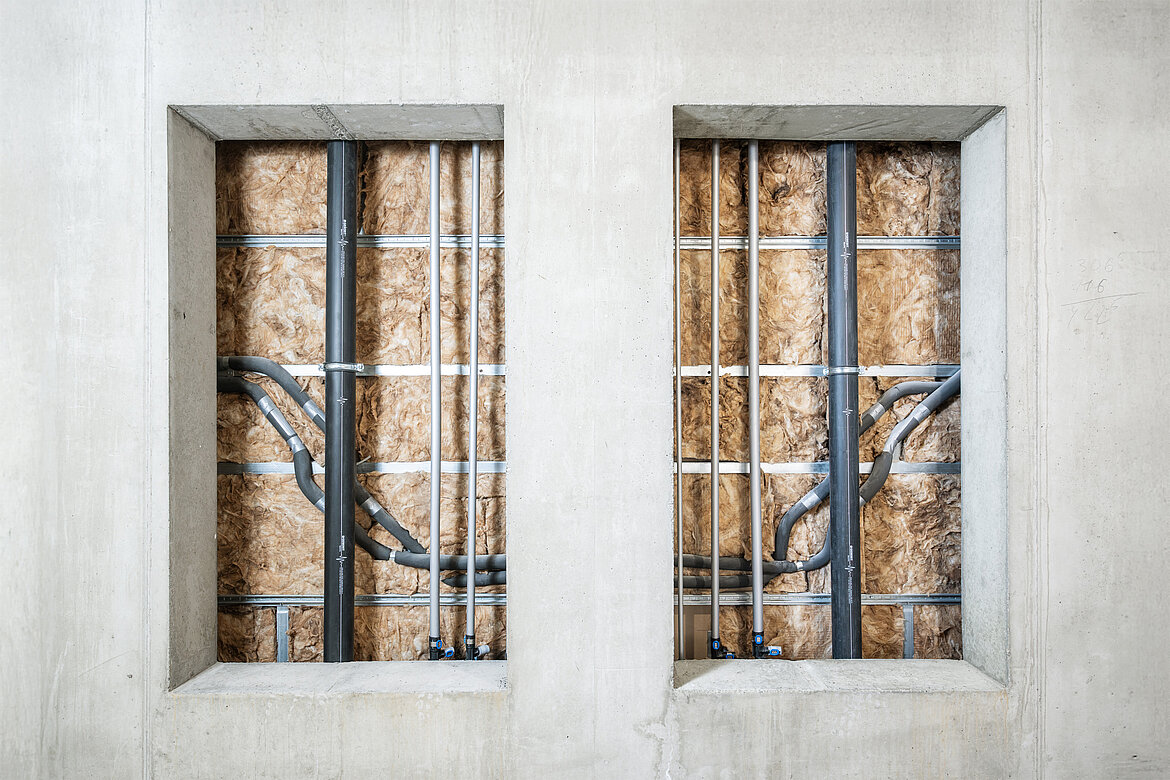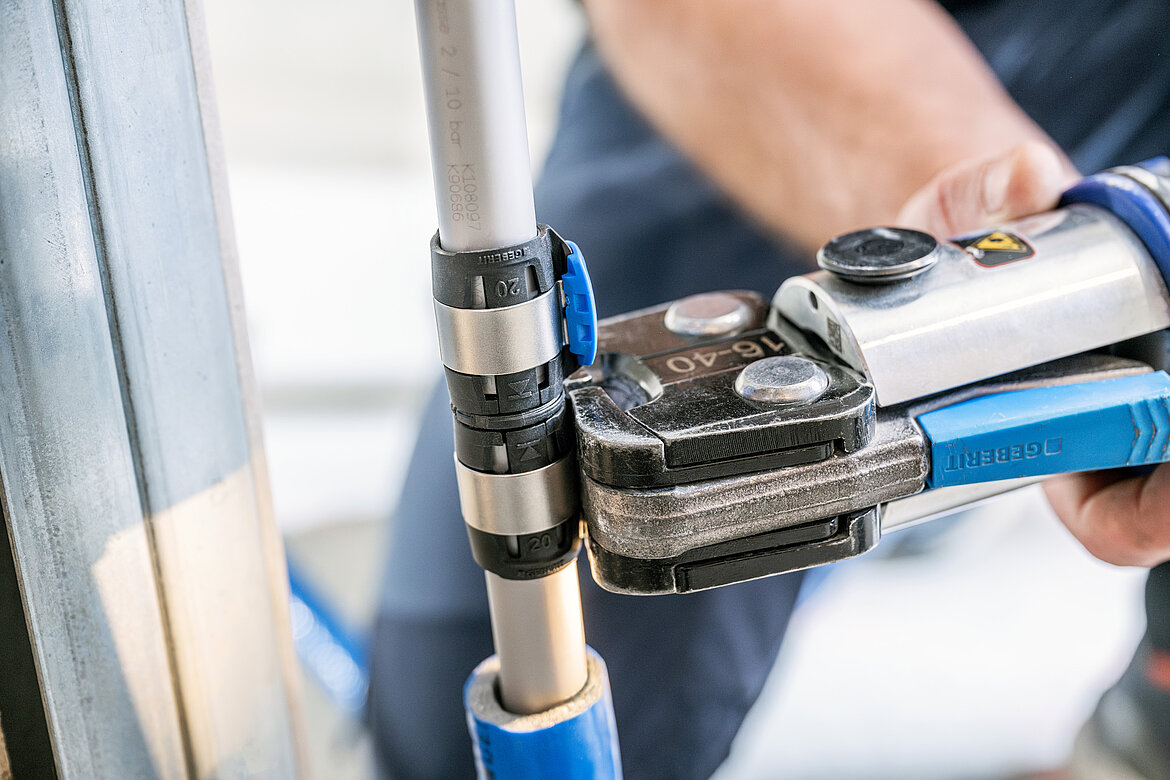 Bei der Trinkwasser- und Heizungsinstallation setzten die Projektbeteiligten konsequent auf bewährte Systeme aus dem Geberit Sortiment. Für die Trinkwasserversorgung der Fertigmodule sowie für die Etagenverteilungen im Gebäude kam das Mehrschichtverbundrohrsystem Geberit FlowFit zum Einsatz. Besonders praktisch war, dass für die Dimensionen 16 bis 40 mm nur eine Pressbacke benötigt wurde, was die Abläufe vereinfachte und spürbar Zeit auf der Baustelle sparte. Zusätzlich erleichterten drehbare Pressstellen das Verpressen der Fittings in räumlich beengten Montagesituationen.