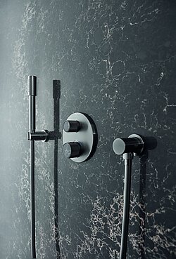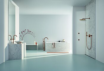 Für ein einheitliches und harmonisches Gesamtbild können die Quarzakzente in den umgebenden Wand- und Oberflächenmaterialien aufgegriffen werden. Die Atrio Private Collection ist zudem für alle Bereiche des Badezimmers erhältlich - von Waschbecken- bis hin zu Badewannen- und Duscharmaturen.