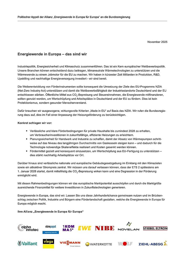 Angesichts der laufenden Debatte über die Neugestaltung der Bundesförderung für effiziente Gebäude (BEG) richtet die neu formierte Allianz „Energiewende in Europa für Europa“ einen dringenden Appell in Form eines offenen Briefes (anbei) an die Bundesregierung. Das Bündnis führender europäischer Hersteller und Anbieter von Klima- und Heizungslösungen fordert eine strategische Neuausrichtung: Öffentliche Mittel für die Wärmewende müssen gezielt zur Stärkung der europäischen Produktion und Wertschöpfung eingesetzt werden.