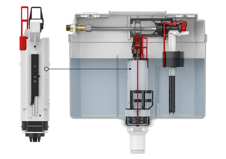 Die neue 4/2-Liter-Spülung bietet eine einfache und effektive Möglichkeit, den Wasserverbrauch im Bad deutlich zu reduzieren. Der Clou: Bereits installierte Uni und Base Spülkästen können mit dem optimierten Ablaufventil A2 nachgerüstet werden. Das spart nicht nur Wasser, sondern auch Ressourcen, denn der Austausch kompletter Spülkästen entfällt. Durch die exakte Einstellung des Spülvolumens – 4 Liter für die Vollspülung und 2 Liter für die kleine Spülmenge – wird der Trinkwasserverbrauch für die Toilettenspülung, der derzeit rund 27 Prozent des täglichen Wasserverbrauchs ausmacht, spürbar gesenkt.