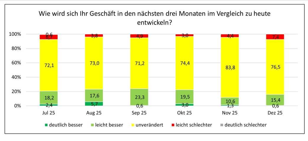 Im Dezember 2025 gab es in der Stichprobe ca. 4% SHK-Handwerker, die ihre aktuelle Geschäftslage schlechter als "ok" bezeichneten. Bei ca. 19% läuft es sehr gut, bei weiteren ca. 42% läuft es gut. Im Antwortspektrum gab es Veränderungen der Verteilung in Richtung "ok". Aus beiden Richtungen (besser oder schlechter) sind ca. 4% in Richtung "ok" gewandert.