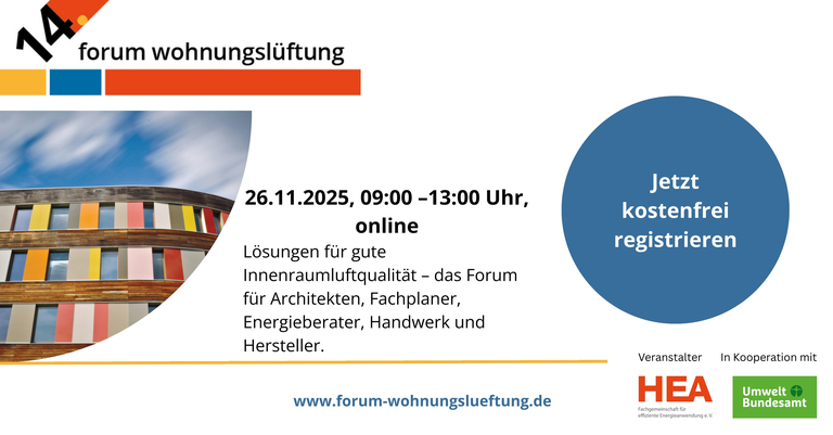 Das digitale Forum Wohnungslüftung findet am 26.11.2025 von 09:00 Uhr bis 13:00 Uhr statt. Weitere Informationen sowie die Möglichkeit der kostenfreien Anmeldung finden Sie unter www.forum-wohnungslueftung.de