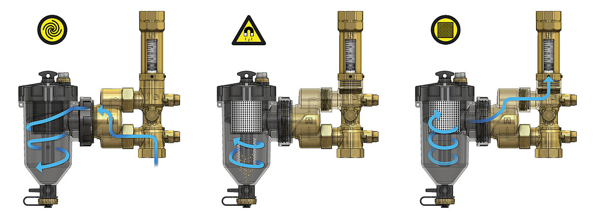 Im laufenden Betrieb sorgt bei AHS 560 der Magnet-Schlammabscheider ADS 160 mit starkem Neodym-Magnet und mehrstufiger Filtration für eine effektive Abscheidung von Magnetit und Verschmutzungen. Zuerst strömt das Systemwasser in spiralförmiger Bewegung über einen Zyklonfilter. Im zweiten Schritt findet die Magnetabscheidung statt. Hierbei zieht ein 14.000-Gs-starker Neodym-Magnet sämtliche metallischen