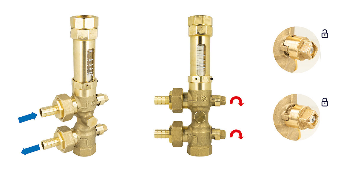 Bei der Installation oder Wartung kann die Kombination zum Spülen und Befüllen der Anlage verwendet werden. Dabei werden anstelle des Abscheiders die mitgelieferten Schlauchanschlüsse aufgeschraubt. Dank integrierter Kugelhähne können beide Anschlüsse zu Umbau, Rückbau und Reinigung sicher verschlossen werden.