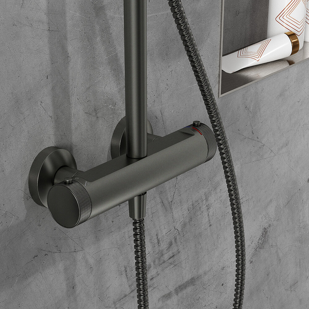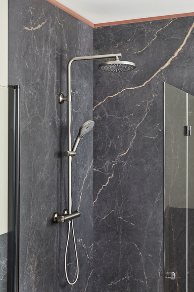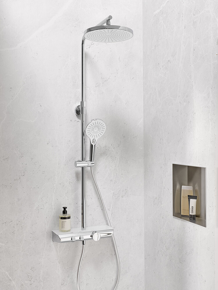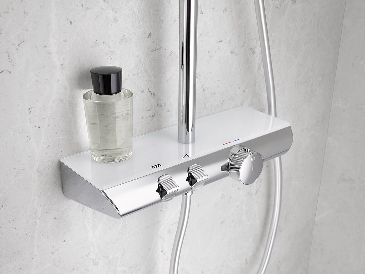 Ein herausragendes Produkt der Serie ist das Shower-Set AquaXPro 200 Thermostat, welches auch die Jury der SCHÖNER WOHNEN mit durchdachtem Produktdesign und cleveren Features überzeugte und daraufhin mit dem BEST OF DESIGN AWARD ausgezeichnet wurde. Die Wasserregulierung – Menge und Temperatur – wird einfach und leichtgängig über Gleitregler gesteuert – so ist auch ein Dualbetrieb von Hand- und Kopfbrause möglich. Für maximalen Bedienkomfort sind alle Funktionselemente mit einer Rändelstruktur gripoptimiert – das erleichtert die Nutzung mit nassen Händen. Für höchste Sicherheit beim Duschen sorgt die zuverlässige und hochwertige Technik des modernen Sicherheitsthermostats: Rückflussverhinderer, 38° C-Sicherheitssperre und Kaltwasser-Ausfallsicherung schützen vor Verbrühungen und machen das Duschvergnügen besonders sicher. Praktisches Extra: Die integrierte Echtglasablage bietet eine großzügige Abstellmöglichkeit für Shampoo, Duschgel & Co. Die Kopfbrause mit einem Durchmesser von 25 cm hüllt den gesamten Körper in wohltuend warmes Duschwasser und lässt sich individuell in der Höhe justieren und schwenken. Die runde AquaXPro Designhandbrause verwandelt mit den drei verschiedenen Strahlarten Rain, SoftRain und Massage jedes Bad in ein Privat-Spa. Praktisch für den Nutzer: Antikalk-Noppen vereinfachen die Reinigung der Brausen und dank beidseitiger Verdrehsicherung bleibt der Brauseschlauch auch langfristig in Form. Bei Renovierungen erweist sich die höhenverstellbare Wandanbindung des Shower-Sets AquaXPro 100 Thermostat als besonders vorteilhaft. Bereits bestehende Bohrlöcher können genutzt oder verdeckt werden, wodurch weniger Aufwand entsteht.