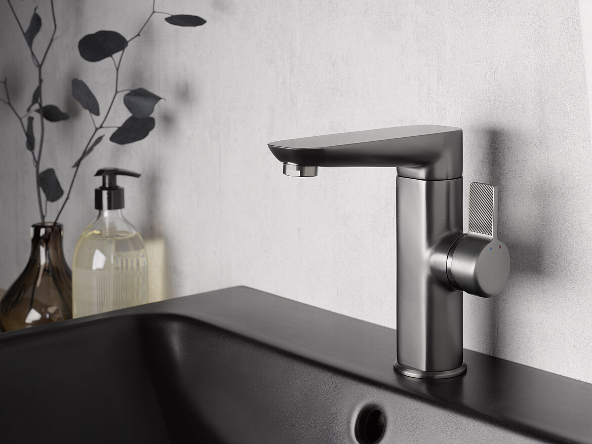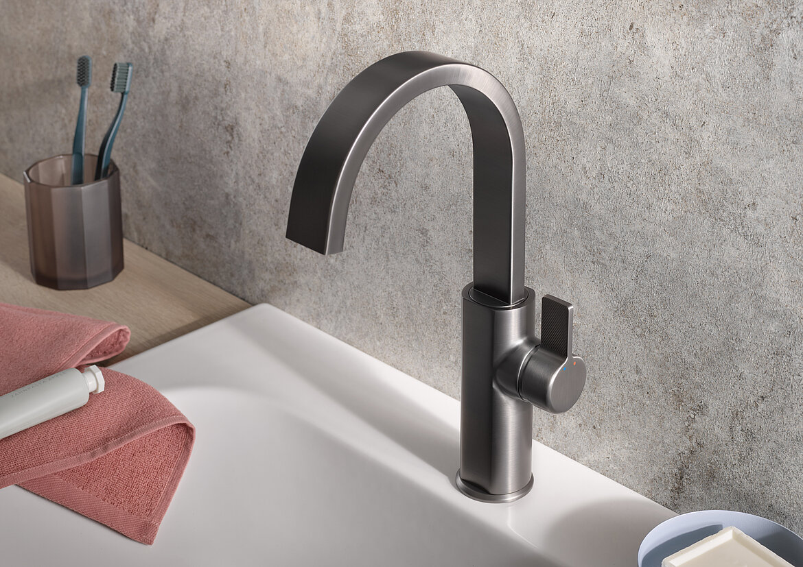 Für einen einheitlichen Look im Bad: Der moderne Waschtisch-Einhebelmischer AquaXPro ist ebenfalls in den Farben Chrom, Schwarz-matt, Gunmetal gebürstet oder Kupfer gebürstet erhältlich. Die platzsparende L-Form erlaubt eine Schwenkbarkeit des Auslaufs um 360°. Bildnachweis: HSK Duschkabinenbau KG