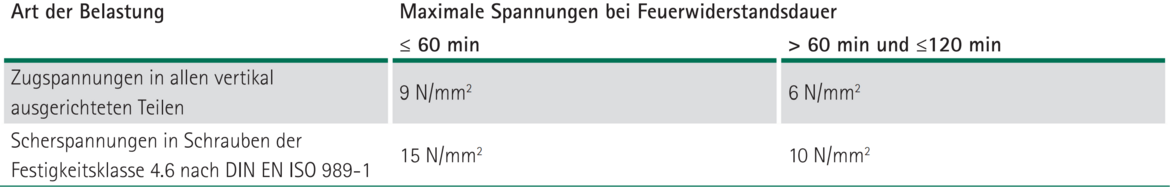 - Die Halterelemente aus Stahl müssen so dimensioniert werden, dass die berechneten Spannungen die Werte der nachfolgenden Tabelle nicht überschreiten