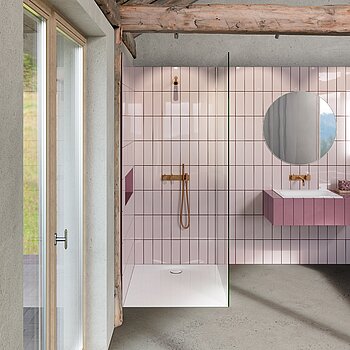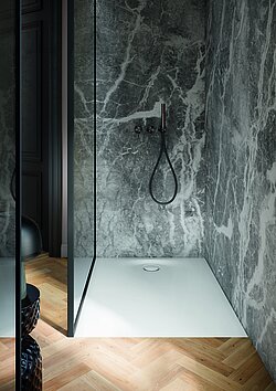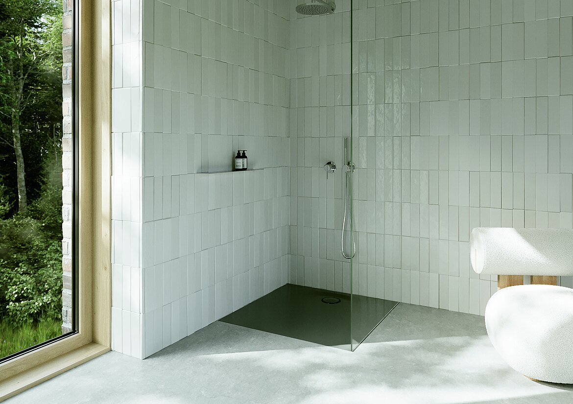 Bauweise sicher und sauber zum Ablauf. So entsteht ein puristischer Duschplatz, der nicht nur leicht und großzügig wirkt, sondern im Alltag auch zuverlässig funktioniert. Die geringe Aufbauhöhe wird damit nicht zum Kompromiss, sondern zum echten Komfortgewinn. Der wandnahe Ablauf auf der schmalen Seite schafft zudem eine angenehme, durchgehende Standfläche und unterstützt die klare architektonische Anmutung.