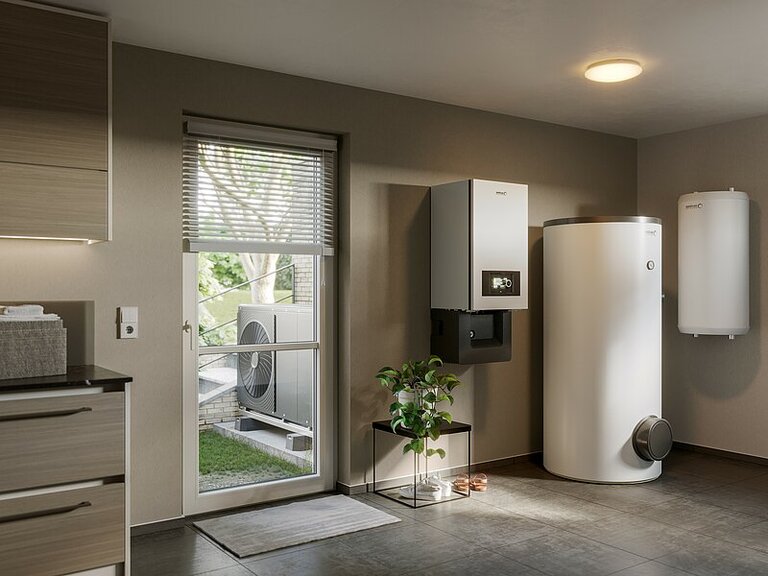 Für den monovalenten Alleinbetrieb in einem energetisch ertüchtigten Gebäude bietet sich die Geräteversion MH an. In ihrem Innenteil ist ein 6 kW starker E-Heizstab verbaut, der sich in Spitzenbedarfsphasen zuschaltet. Die Version OH ohne Heizstab verfügt über einen Anschluss 2 x G1" VL/RL für Gas-Brennwertkessel. Damit eignet sie sich ideal zur hybriden Wärmeversorgung mit fossiler Unterstützung bei sehr kalten Temperaturen, zum Beispiel in älteren Bestandsgebäuden.