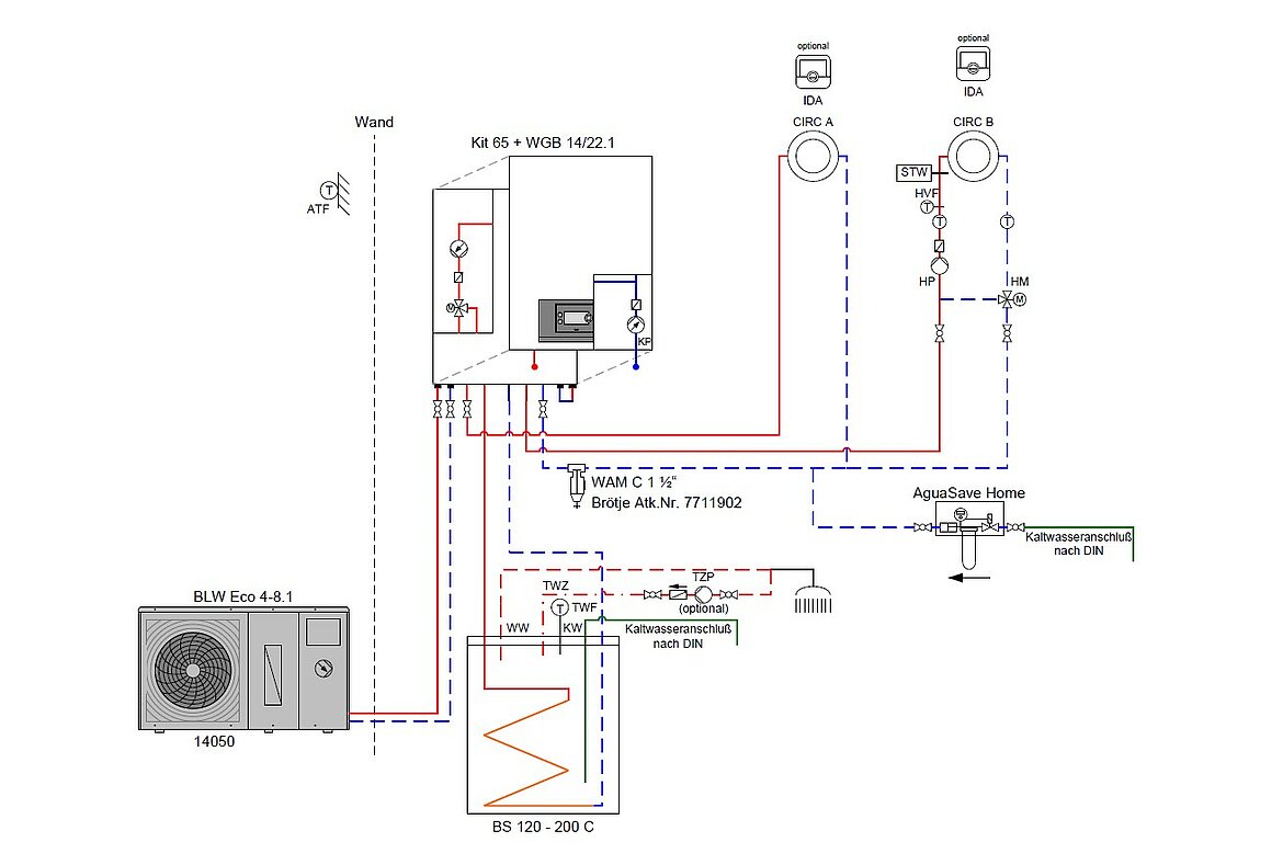 Die Wärmepumpen-Schnittstelle Kit 65 ist kompatibel mit Gas-Brennwertkesseln WGB 14.1 – 22.1. In Kombination mit den Monoblock-Wärmepumpen der Serie BLW Eco.1 ergeben sich versorgungssichere Hybrid-Konstellationen, die bis zu 23,9 kW Gebäudeheizlast gesetzeskonform abdecken (Niedertemperaturbetrieb, Teillastpunkt „A“ – 7 °C, § 71h GEG). Das BRÖTJE Auslegungstool hilft hier bei der Planung. Eine Kit 65-Version zum Anschluss der Gas-Brennwertgeräte WBS und WMS soll 2024 erscheinen. Für 2025 plant BRÖTJE bodenstehende Gas-Brennwertgeräte mit Integrationsoption für das Kit 65.