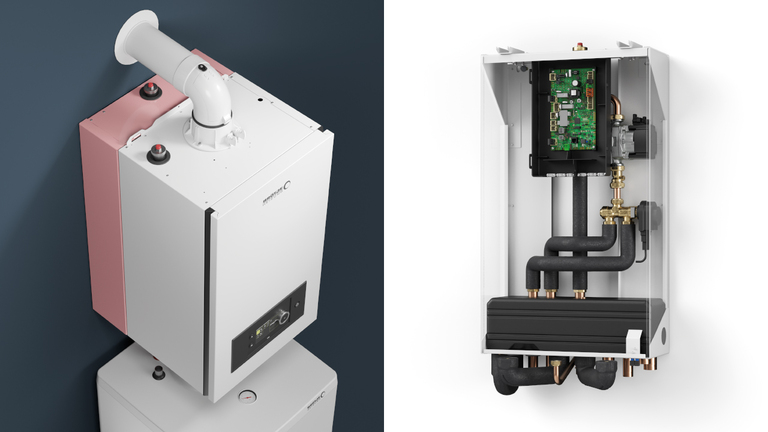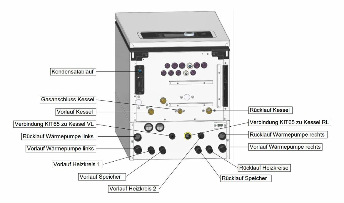 Seitenabdeckungen und Regelungsbox am Kit 65 lassen sich bei Bedarf demontieren, Systemkomponenten wahlweise nach links oder rechts ausrichten. Das Anschluss-Set umfasst ein Vor- und Rücklaufrohr zum Kessel mit Dämmung, Anschlussplatine für die Installation im Kessel, Verschlusskappen, Dichtungen und Endwiderstand. Ein eigenes Typenschild beschleunigt die Supportabwicklung.