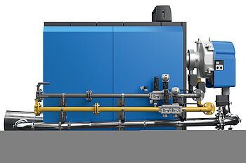 Für die Umwelt macht sich ein Heizbetrieb mit CO2-neutralem Wasserstoff bezahlt: Im Vergleich zur Erdgasverbrennung können bis zu 350 Tonnen CO2 pro Kessel und Jahr eingespart werden (ermittelt per interner Systemberechnung). Die optimal abgestimmte Kombination aus Kessel und Brenner sorgt für höchste Effizienz bei gleichzeitig minimalen Emissionen. Darüber hinaus senkt die im Erdgas- als auch im Wasserstoffbetrieb serienmäßig enthaltene Abgas-Rückführung die Stickoxidemissionen (NOx) auf ein Minimum.