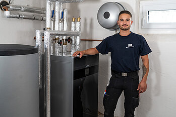 Techniker Hamberger hebt die intelligente Raumausnutzung hervor: „Wir hatten keinen Platz für zusätzliche Pufferspeicher. Die Logatherm WLW186i TP70 mit integriertem Pufferspeicher war daher ideal – besonders für ein Bestandsgebäude mit kleinem Keller.“