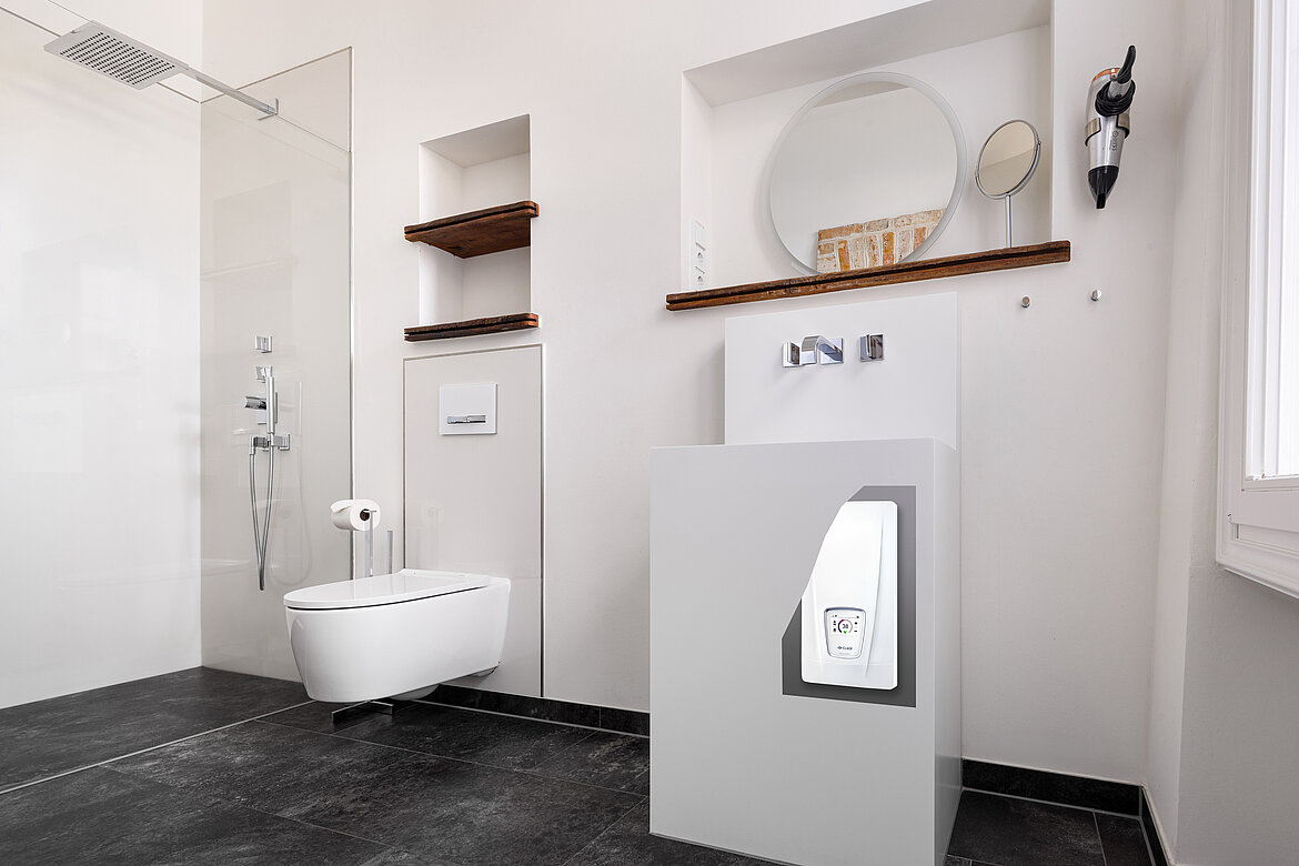 Die Entscheidung für eine dezentrale Warmwasserversorgung ermöglichte eine schlankere Auslegung der zentralen Heizungsanlage. Dadurch arbeitet das gesamte System wesentlich effizienter. Die kompakten Durchlauferhitzer sind zudem platzsparend und optisch unauffällig installiert. Sie befinden sich versteckt in den Unterschränken der Waschbecken. Die Bedienung erfolgt komfortabel über eine kleine Funkfernbedienung, die den Gästen jederzeit die präzise Einstellung ihrer gewünschten Duschtemperatur ermöglicht. Weil das Wasser direkt im Durchfluss erwärmt wird, können die Gäste zu jeder Tages- und Nachtzeit in Wunschtemperatur duschen solange sie wollen. Keine Temperaturschwankungen – kein Speicher der leer laufen könnte. Das ist moderner Warmwasserkomfort.