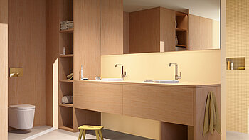 Oberflächen aus Chrom und Edelstahl entfalten insbesondere in Verbindung mit Holz ihre Wirkung, wie IMO hier am Waschtisch beweist.