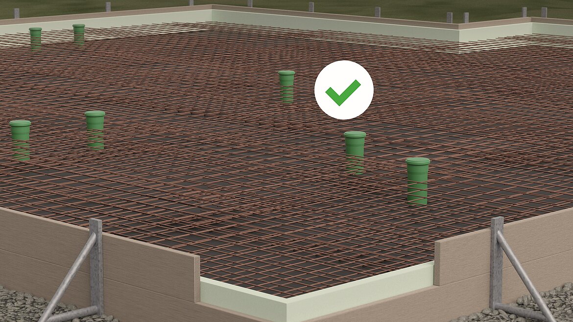 Für diese Ausführung gibt es zwei Möglichkeiten: 1. Nachträgliches Einstemmen: Dabei wird die Bodenplatte später manuell bearbeitet, was mit erheblichem Zeit- und Kraftaufwand verbunden ist. 2. Vorplanung von Aussparungen: Hierbei werden bereits bei der Planung Bereiche freigelassen, die später vergossen werden. Allerdings führt dies zu zusätzlichen Arbeitsschritten wie Koordinationsaufwand der Gewerke und Fahrten zur Baustelle. Beide Varianten bringen erhöhten Aufwand mit sich.