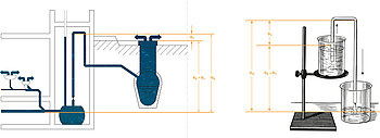 Bei Abwasserhebeanlagen besteht durch den sogenannten Saughebereffekt die Gefahr des Rücksaugens von Schmutzwasser aus dem öffentlichen Abwasserkanal über die Abwasserhebeanlage ins Gebäude. Abb. 3 zeigt die Analogie zum allgemein bekannten Versuch aus dem Physikunterricht. Über die hydrostatische Druckdifferenz ∆p=ρgh2-h1 kann Flüssigkeit von einem Behälter in einen tiefergelegenen Behälter umgefüllt werden.