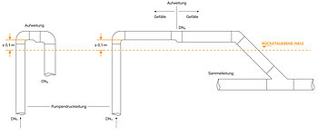 Rückflussverhinderer sind Bestandteil der Abwasserhebeanlage und sollen das Rückfließen von Schmutzwasser verhindern. Es besteht jedoch die Gefahr, dass diese aufgrund der Begleitstoffe im Schmutzwasser, insbesondere Feuchttücher, nicht schließen. Um das Rücksaugen durch den Saughebereffekt zu vermeiden, wurden folgende Änderungen in der Ausführung von Rückstauschleifen in Pumpendruckleitungen vorgenommen: Die Sohle der Rückstauschleife muss mind. 0,1 m über die Rückstauebene geführt werden. Zudem ist in der Rückstauschleife eine Aufweitung in die nächstgrößere Rohrdimension vorzusehen. Durch diese Überleitung in die Freispiegelentwässerung wird eine Vollfüllung der Pumpendruckleitung bis in den Straßenkanal vermieden. Abb. 4 zeigt beispielhaft mögliche Ausführungsvarianten der Rückstauschleife.