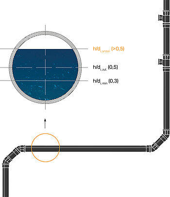 Durch diese Änderungen besteht bei einer nennweitengleichen Ausführung einer Fallleitungsverziehung die Gefahr der Überlastung bis hin zum Zuschlagen des Querschnitts in der liegenden Leitung der Verziehung. Der „Flaschenhals“ liegt hierbei vor dem ablaufseitigen Bogen einer Fallleitungsverziehung, siehe Abb. 7.