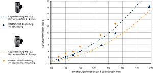 Bei Fallleitungsverziehungen (Achsversatz > 1 m und/oder Richtungsänderungen > 45 °) werden aufgrund nachstehender Erläuterung Änderungen erforderlich. Bis zur Einführung der DIN EN 12056 in Verbindung mit DIN 1986-100 wurden Fallleitungen wie liegende Leitungen mit Mindestgefälle dimensioniert. Das Mindestgefälle betrug zu diesem Zeitpunkt J = 2 cm/m. Mit dieser Regelung konnten Fallleitungen problemlos nennweitengleich verzogen werden. Mit Einführung von DIN EN 12056 in Verbindung mit DIN 1986-100 können Fallleitungen in Abhängigkeit vom Einlaufabzweig (bogenförmig mit Innenradius oder 87-88,5°) wesentlich höher belastet werden. Zugleich wurde das Mindestgefälle für belüftete liegende Leitungen auf J = 0,5 cm/m abgesenkt, wobei sich in der Praxis ein Mindestgefälle von J = 1 cm/m etabliert hat. Abb. 6 verdeutlicht die Zusammenhänge.
