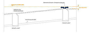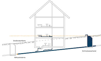 So wird die Definition der Rückstauebene nun präzisiert, auch um die abstrakte Definition aus DIN EN 12056-1 etwas greifbarer zu machen. Nach neuer Definition für die maßgebliche Rückstauebene ist der wirksame öffentliche Entspannungspunkt zuzüglich eines Sicherheitsabstands relevant. Der Sicherheitsabstand wird als Überstauhöhe bezeichnet, um im Rückstaufall auch den Überstau bei einem Wasseraustritt aus der Kanalisation zu erfassen. Abb. 2 zeigt die Lage der Rückstauebene nach neuer Definition am Beispiel eines Kanalanschlusses in Hanglage.