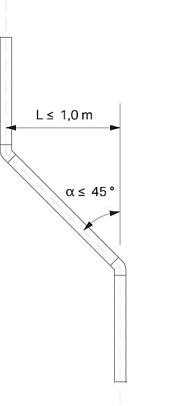 Der Normentwurf unterscheidet nun zwischen Fallleitungsversprüngen und -verziehungen. Bei Versprüngen mit einer maximalen Auslenkung von 1 m und Richtungsänderungen ≤ 45° sind – unabhängig von der Fallleitungslänge – keine besonderen Maßnahmen erforderlich (siehe Abb. 5). Der Versprung bleibt in den Bemessungsregeln für Fallleitungen (DIN 1986-100 – Tab. 8) und kann nennweitengleich ausgeführt werden. Lediglich Anschlüsse innerhalb des Versprungs sind nicht zulässig.
