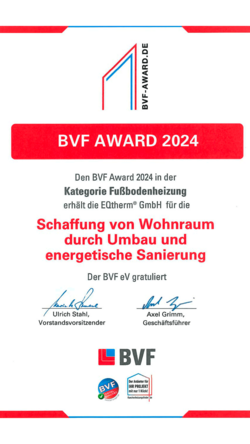Der Bundesverband Flächenheizung und Flächenkühlung e.V. (BVF) hat EQtherm den „BVF Award” in der Kategorie Schaffung von Wohnraum durch Umbau und energetische Sanierung verliehen. Im Rahmen der Komplettsanierung einer denkmalgeschützten Scheune in Wolfsburg werden EQ Flächenheiz- und Kühlsysteme erfolgreich in ein innovatives Effizienzkonzept mit erneuerbaren Energien integriert. Das Projekt läuft bis 2025: Im Wolfsburger Stadtteil Ehmen können dann 18 neue Mietwohnungen bezogen werden.