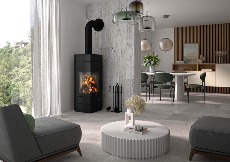 Das Besondere: Mit bis zu drei Quadern lässt sich das 1,12 Meter hohe Grundmodell um jeweils 17 cm erweitern. Hinter der markanten Optik verbergen sich in jedem Element über 70 Kilogramm Spezial-Schamotte, die während des Betriebes die überschüssige Wärme speichern und nach Erlöschen der Flammen bis zu 12 Stunden lang als wohltuende Strahlungswärme abgeben. Dank der variablen Speichermasse lässt sich der Heizbedarf an die Raumgröße anpassen und verwandelt den Mondego W+ in einen echten Wärmeriesen.
