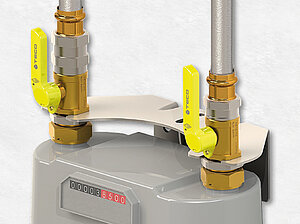 - KM3: Installationskit für Zweirohr-Gaszähler, mit nach DIN EN 331 zertifizierten Kugelhähnen, verzinkter Stahlhalterung und Hebel mit abschließbarer Öffnung.