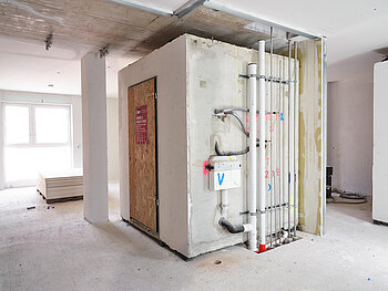 Schon in der frühen Planungsphase lag ein weiterer Fokus der Planer auf der Qualität und Langlebigkeit der eingesetzten Bausysteme und Baumaterialien, auch mit Blick auf die Wirtschaftlichkeitsbetrachtungen für den Bauprozess sowie den späteren Betrieb des Gebäudes. Aus diesem Grund kamen vorgefertigte Bauelemente zum Einsatz, im TGA-Bereich zum Beispiel Fertignasszellen oder Sanitärboxen in den Küchen. Der hohe Vorfertigungsgrad der Bauelemente optimiert den Bauablauf und erleichtert die Installation maßgeblich. Für die Planung und Ausführung sind Termin- und Kostensicherheit weitere wesentliche Vorteile beim Einsatz der vorgefertigten Baugruppen.