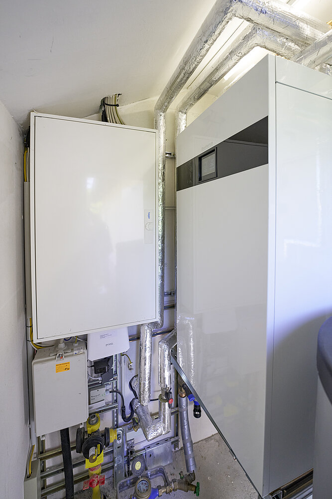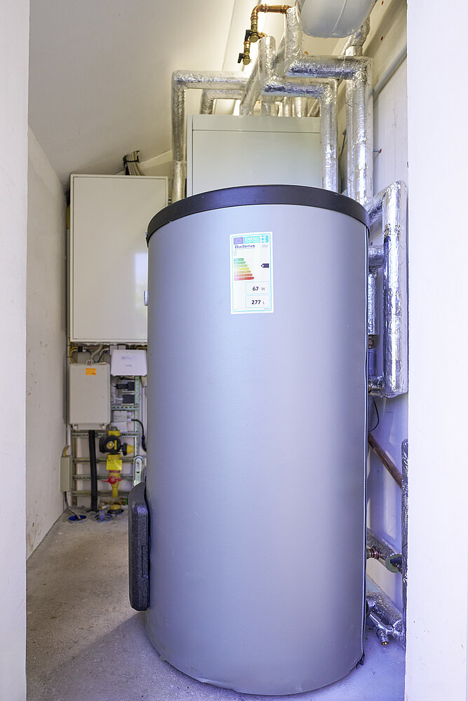 Je nach Gebäude hat das Projektteam die Wärmepumpen-Inneneinheit mit integriertem 70-Liter-Pufferspeicher oder als Komfort-Hydraulik-Inneneinheit mit integriertem 180-Liter-Warmwasserspeicher installiert. Im Aufstellraum beansprucht die bodenstehende Inneneinheit weniger als 0,4 Quadratmeter Fläche, diese kompakte Bauweise war ein wichtiges Kriterium. Die Heizwärme wird über Fußbodenheizungen mit einer Auslegungstemperatur von 37 °C verteilt. Separate Warmwasserspeicher Logalux SH290 RS-B vervollständigen die Systeme. Dieser Speichertyp wurde mit seinem großflächigen Wärmetauscher speziell für Wärmepumpen entwickelt und fasst knapp 280 Liter. Die Thermoglasur gewährleistet eine hohe Trinkwasserqualität und schützt den Speicher zusammen mit einer Magnesiumanode vor Korrosion.