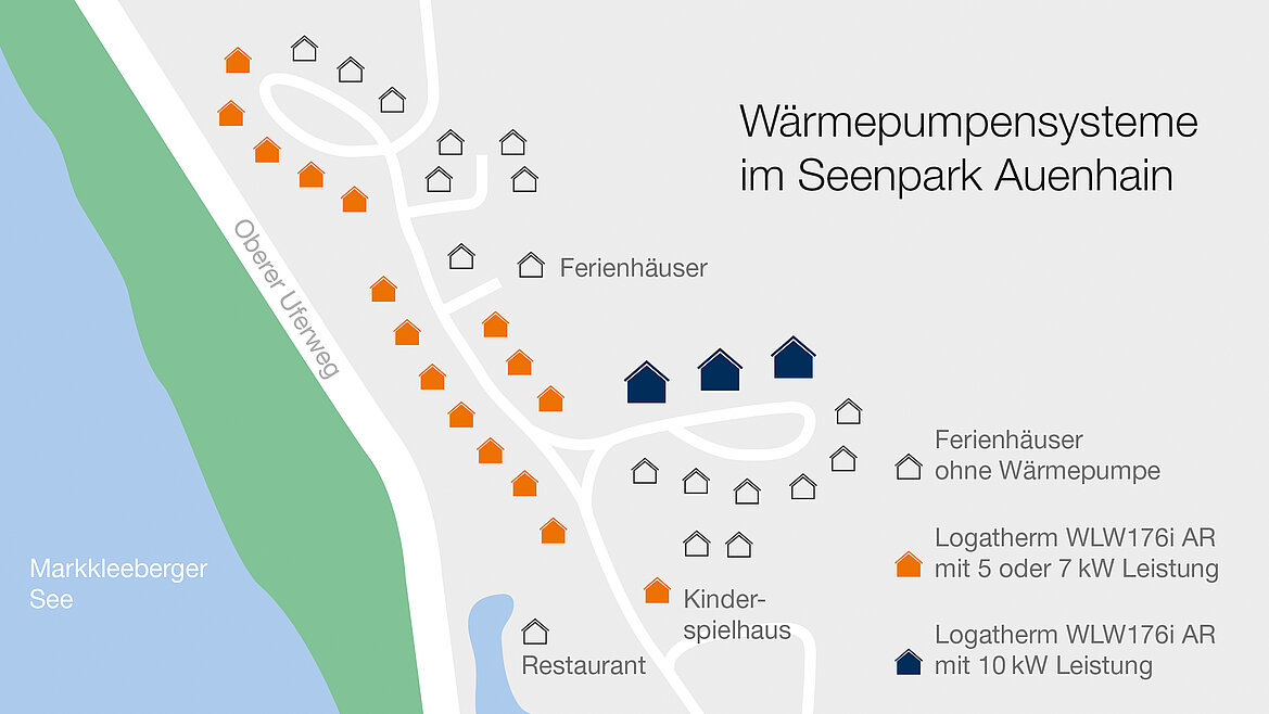 Natur, Wasser, Sport- und Freizeitaktivitäten – am Markkleeberger See bei Leipzig lässt es sich gut aushalten. Und nur wenige Gehminuten vom Ufer entfernt finden Gäste im Seepark Auenhain eine komfortable Unterkunft. Der Ferienpark bietet insgesamt 32 Ferienhäuser sowie 3 Apartmenthäuser mit insgesamt 12 Ferienwohnungen. Zu einem entspannten Urlaub trägt dort jetzt neue Heiztechnik bei: Die Betreiber des Ferienresorts ließen die Heizsysteme von 19 Häusern mit je einer Luft-Wasser-Wärmepumpe Logatherm WLW176i AR von Buderus modernisieren. Ein Projekt im großen Stil – und weitere Wärmepumpen werden folgen. Denn die Wärme für Heizung und Warmwasser wird nun ganzjährig effizient und umweltschonend erzeugt. Und vor allem besonders leise: Vom laufenden Betrieb bekommen die Urlaubsgäste nichts mit. Das ist der geräuschreduzierenden Technologie der modernen Geräte zu verdanken.