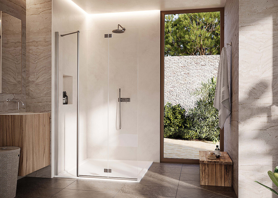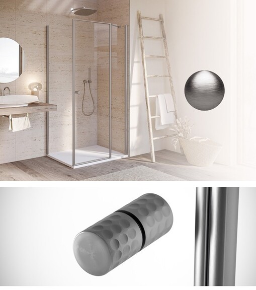 Die gebürstete Struktur bringt die präzisen Details der Serie eindrucksvoll zur Geltung. Griff, Magnetleiste, Profile und die Rohrscharniere - in INO ausgeführt - verleihen der Duschkabine eine besondere Ausstrahlung und betonen ihre moderne Ästhetik.