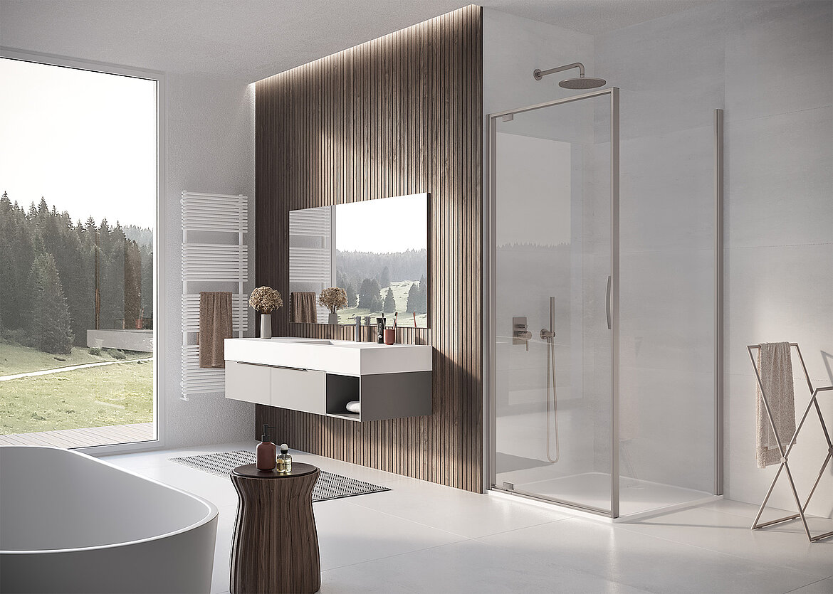 - und unterstreicht die Formen der Duschkabine.