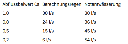 Prinzipiell kann man sagen, dass bei einem kleineren Abflussbeiwert die Regelentwässerung ebenfalls kleiner dimensioniert wird. Die Notentwässerung hingegen muss größer ausgelegt werden, da der Spitzenabflussbeiwert Einfluss auf die Differenz zwischen der Regel- und Notentwässerung nimmt:.