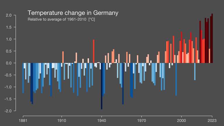 Global gesehen steigen die Temperaturen im Jahresmittel kontinuierlich an. Betrachtet man dies kleinteiliger, auf europäischer oder deutschlandweiter Ebene, zeigen sich durch geografische Einflüsse etwas größere Abweichungen. Eine anschauliche Darstellung dazu bietet die Internetseite: showyourstripes.info/