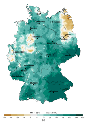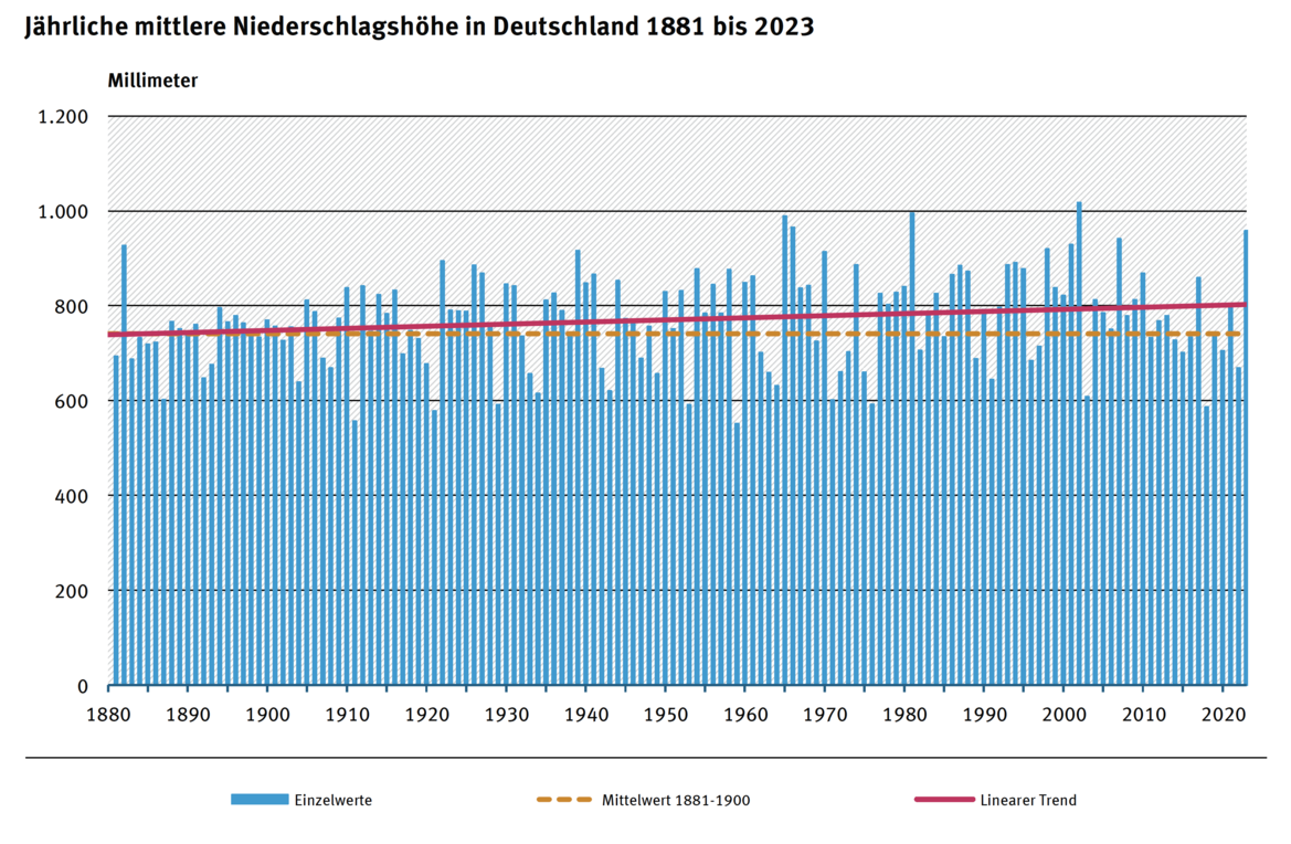 Seit 1881 hat die mittlere jährliche Niederschlagsmenge in Deutschland um rund 8 Prozent zugenommen. Dieser Anstieg verteilt sich jedoch nicht gleichmäßig auf die Jahreszeiten. Insbesondere die Winter sind deutlich nasser geworden, während die Niederschläge im Sommer geringfügig zurückgegangen sind. Im Durchschnitt steigt mit den Temperaturen auch die Verdunstung von Wasser an, was insgesamt zu größeren Niederschlagsmengen führt. Allerdings treten regional und saisonal große Unterschiede auf – von Dürren bis hin zu Überschwemmungen.