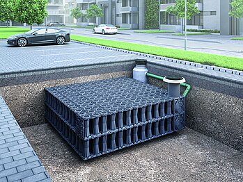 Eine weitere Lösung ist das Ableiten des Regenwassers in ein Rigolensystem. Dieses System kann auf dem Grundstück im Erdreich oder unter Parkflächen installiert werden. Sensoren im Gründach messen die Feuchtigkeit in der Vegetationsschicht, und über Pumpen, Rohre und Tropfsysteme wird das Wasser bei Bedarf wieder auf das Dach zurückgeführt.