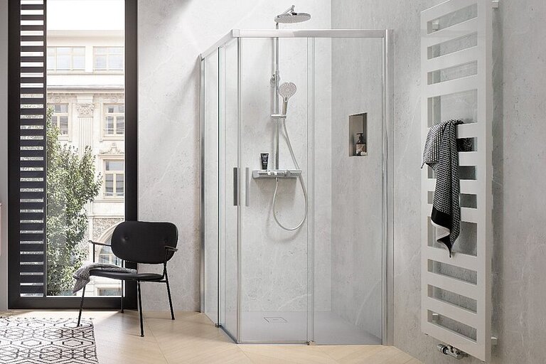 Ob als Nische, Eckeinstieg oder Runddusche – die Modellvielfalt der Serie Favorit macht es möglich, für jede Raumsituation die passende Schiebetür-Lösung zu finden. Ein besonderes Highlight stellt die Walk In Schiebetür dar. Ob direkt neben einer Badewanne, im Schlauchbad oder gegenüber eines Fensters vergrößert sie die Duschzone und erhöht damit den Spritzschutz. So kann selbst in kleinen und verwinkelten Badezimmern ein zeitgemäßer Walk In Duschplatz realisiert werden. Ergänzt werden die Auswahlmöglichkeiten durch verschiedene Profilfarben wie Chromoptik, Alu Silber-matt oder Schwarz-matt. Die Betätigung der Schiebetüren erfolgt mithilfe von elegant reduzierten Griffen in Chrom. Damit harmonisieren die Duschkabinen mit unterschiedlichsten Badezimmer-Farbkonzepten – für einen Look wie aus einem Guss.