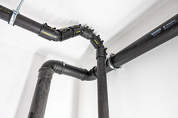 Für die Entwässerung kam eine Kombination aus den Systemen Geberit Silent-Pro und Geberit Silent-PP zum Einsatz. Hiermit konnten die Anforderungen der Bauherren, nach einer hochwertigen und gleichzeitig wirtschaftlichen Lösung, am besten erfüllt werden.