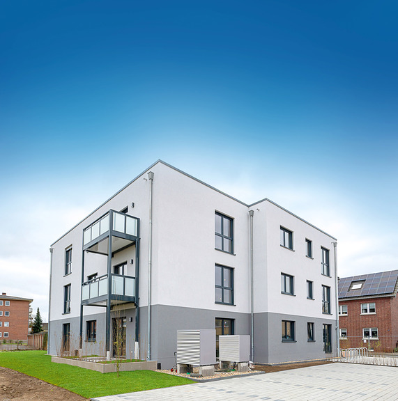 Die drei Mehrfamilienhäuser in Willich-Schiefbahn zeigen, wie sich der Netto-Null-Standard in der Praxis umsetzen lässt[1] – durch konsequente Energieeffizienzmaßnahmen und den Einsatz regenerativer Technologien wie einer Luft-Wasser-Wärmepumpe und Photovoltaikanlage in Verbindung mit einer Fußbodenheizung sowie einer kontrollierten Be- und Entlüftung.