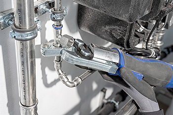 Besonders im Kellergeschoss, wo die Installationshöhe begrenzt war und mehrere Gewerke gleichzeitig arbeiteten, mussten die Leitungen möglichst deckennah verlaufen, um die Kopfhöhe nicht einzuschränken und Konflikte mit Elektroleitungen zu vermeiden. Das Verpressen von Fittings und Bögen direkt unter der Decke ist mit normalen Werkzeugen nur schwer durchführbar, zudem besteht die Gefahr von Fehlverpressungen. Dank der schwenkbaren Pressringe und Zwischenbacken konnten die Rohrleitungen auch in engen Bereichen schnell und sicher verlegt werden. „Die neuen schwenkbaren Pressringe sind perfekt für enge Einbausituationen mit Geberit Mapress und machen die Verarbeitung einfacher und sicherer“, berichtet Sebastian Janssens.